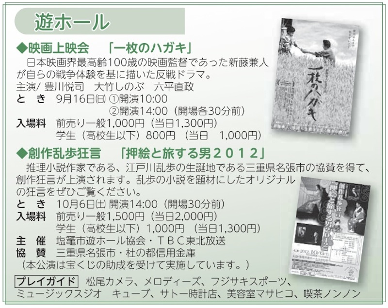 また、今年の10月、東日本大震災で多くの支援をいただいた三重県名張市の申し出があり、遊ホールで狂言を開催することになりました。名張市は乱歩生誕の地であることから、乱歩作品を狂言にして上演しています。塩竈でも乱歩の狂言を上演するきっかけとなるイベントと考えられます。