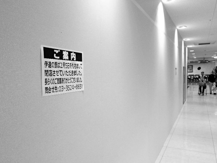 伊達の里、という食堂が撤退していて、店があったスペースは白いパネルで覆われ、そこに「2月5日をもちまして閉店させていただきました」との貼り紙が。