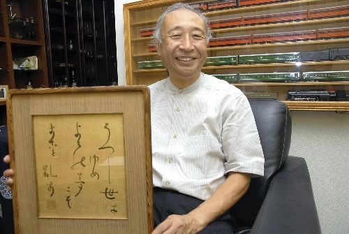 乱歩直筆の歌の額を手に思い出を語る平井さん