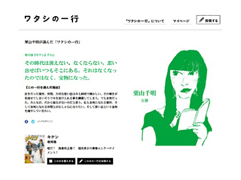 今年は、「ワタシの一行アワード」というコンテストも開催されている。これは、100冊の中から読者が心に残った一行を投稿し、その一行について語り合おうという試みのこと。特設サイトでは、著名人の選んだ一行が公開されており、栗山千明(『キケン』有川浩)、浅田次郎(『金閣寺』三島由紀夫)、石破茂(『零式戦闘機』吉村昭)、草野仁(『こころ』夏目漱石)、佐野史郎(『江戸川乱歩傑作選』江戸川乱歩)、中川翔子(『4TEEN』石田衣良)、平野綾(『僕僕先生』仁木英之)など、合計100人が、お気に入りの一行を取り上げ、感想を綴っている。