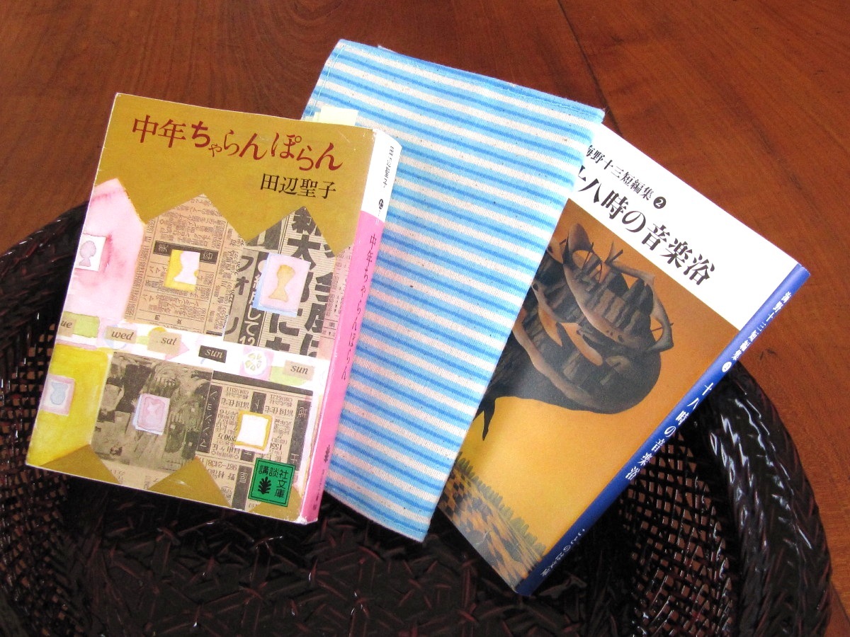 いうまでもないことですけど、まんなかにあるのが縞模様の布製カバーをかけた文庫本です。