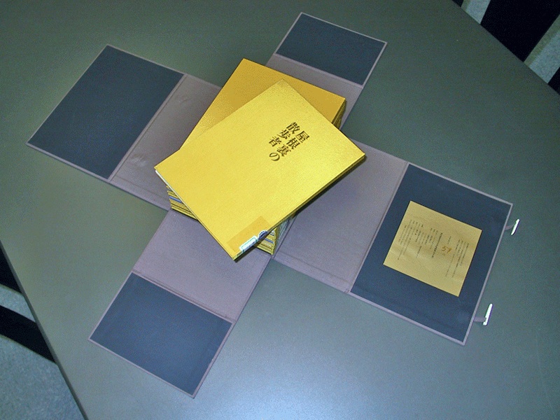 復刻といっても豆本そのままの姿ではなく、池田満寿夫のエッチングが添えられた見開きだけを拡大して製版印刷、製本はせず作品ごとに函に入れ、その九つの函をワンセットとして帙に納めたというしろものですから、大学図書館スタッフのお姉さんが「はい、これです」と持ってきてくれたときにはその大きさに驚かされました。ちなみに直方体をなす帙のサイズは縦二七・六センチ、横二一センチ、高さ一四センチ、ぱかっと開いたところはこんな塩梅。