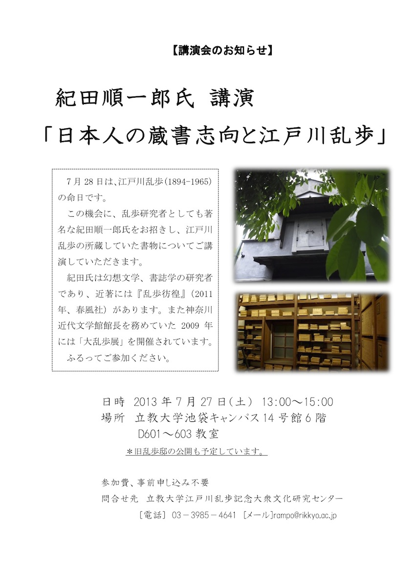 ▼立教大学:立教大学江戸川乱歩記念大衆文化研究センター主催 紀田順一郎氏講演「日本人の蔵書志向と江戸川乱歩」