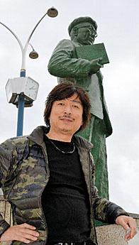 江戸川乱歩像と的場敏訓さん=名張市平尾の近鉄名張駅東口