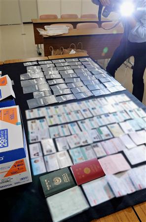 押収された違法薬物と大量の免許証などの身分証明書。逮捕された男は「売人二十面相」の異名で知られていたが、男の“商品”の中には全米を震撼させた猟奇事件の原因ともされる合成麻薬もあったという=4月17日午後、神戸市中央区(一部画像処理しています)