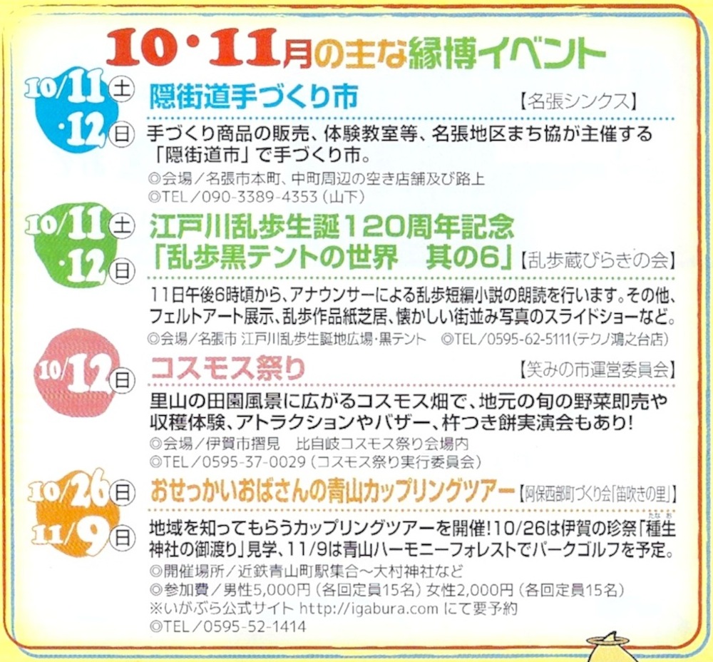 てゆーか、情報発信なんて、そんなものどうでもいいんだよ、というのが関係者の本音であって、要するに、ご町内だけ、身内だけで、ひとりよがりに盛りあがってりゃそれでいい、という寸法なんですけど、けさの新聞に隠街道市のちらしが入ってましたので、乱歩関連イベントふたつ、切り抜いて貼り雑ぜしときますね。