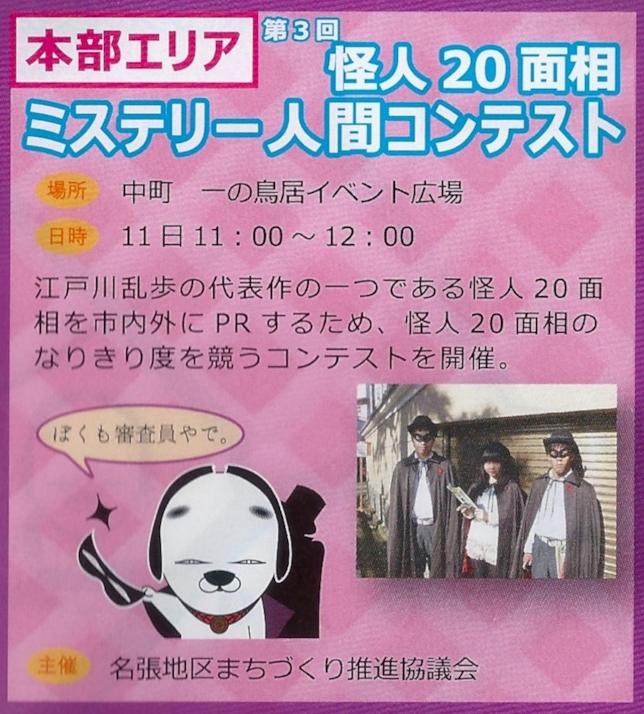 江戸川乱歩の代表作の一つである怪人20面相を市内外にPRするため、怪人20面相のなりきり度を競うコンテストを開催。
