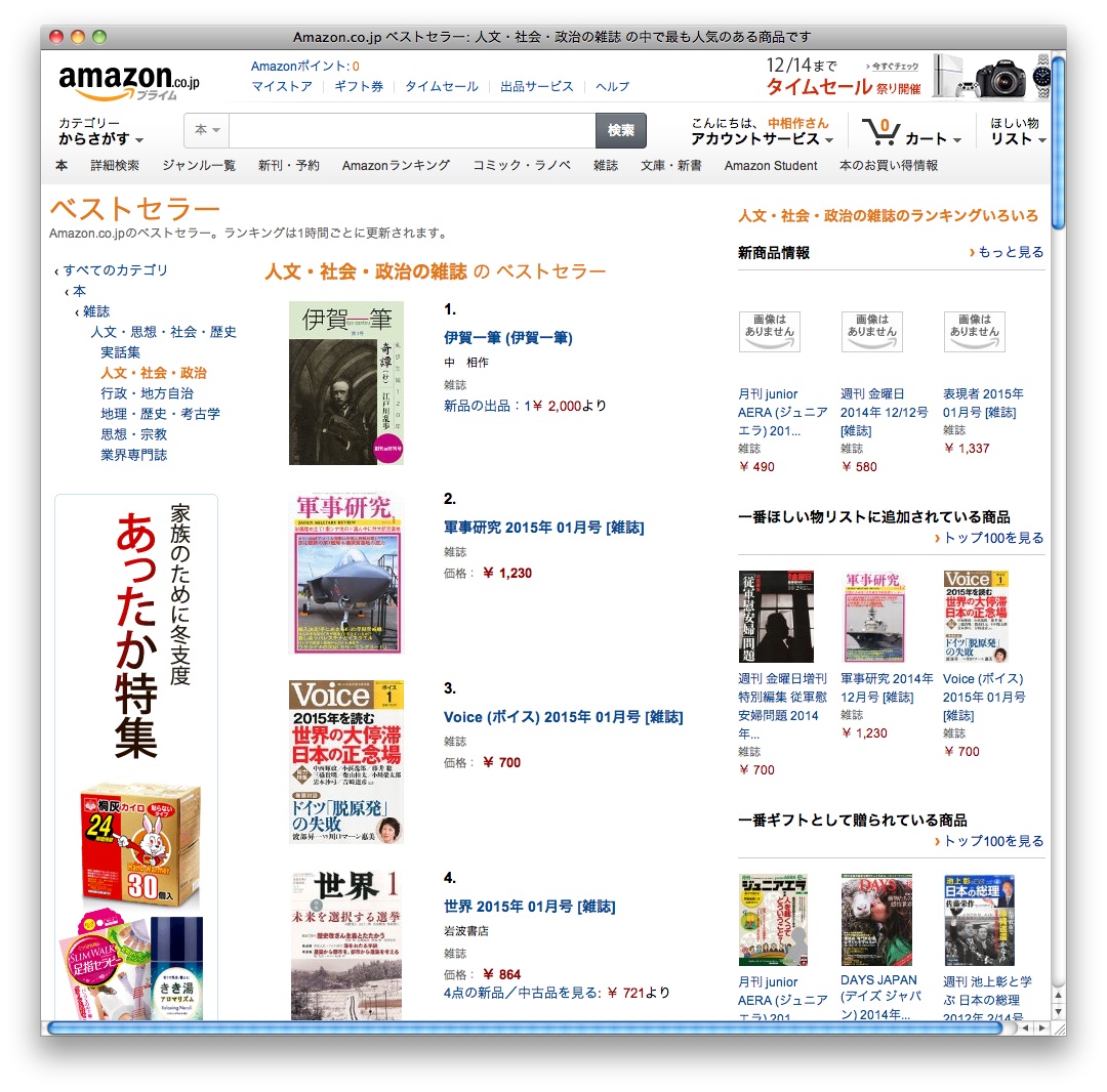 売れてんだかどうなんだか、さっぱりわかりませんけど、と思ってアマゾンにアクセスしてみたら、わはは、「人文・社会・政治の雑誌」でベストセラー第一位となっておるではないか。
