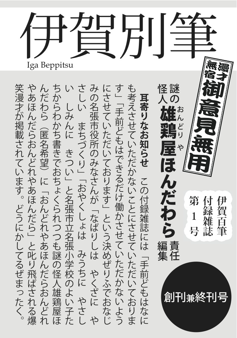 さて、「伊賀一筆」といえば、今秋発行予定の地域雑誌「伊賀百筆」第二十五号のおまけにしてもらおうかしら、と考えている付録雑誌「伊賀別筆」の件ですが、B6判、中綴じとして、表紙はむろんカラーではなくスミ一色、こんな感じでどうかいな、と思案しているところです。