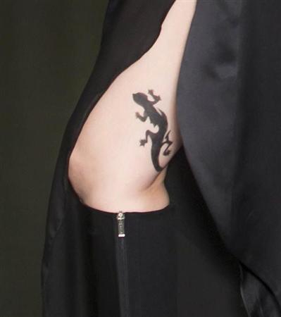 劇中衣装の真矢ミキは美脚に記した黒蜥蜴マークを披露