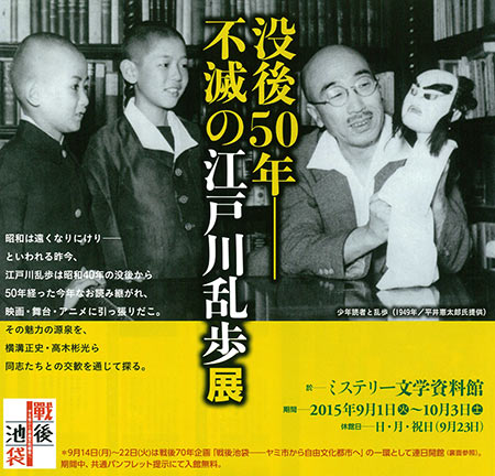 ▼ミステリー文学資料館:「没後50年 ── 不滅の江戸川乱歩展」開催(2015年8月25日)