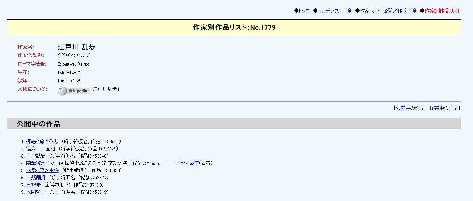 少年探偵団シリーズの更新は、今後月2回程度のようだ。江戸川乱歩の作業中の作品リストには、97タイトルが並んでいる。