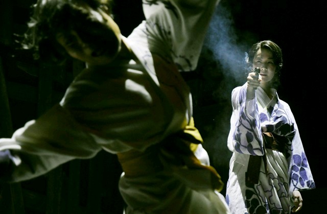 2階建てで、1階部分がさらに3分割された舞台セットを効果的に使いながら、それぞれの短編の筋をたどっていく。倉持が仕掛けた再構成の妙は、肺病の夫がいながら裏であいびきを繰り返すお勢(黒木華)を軸にしたところ。乱歩が明智小五郎のライバルにしようと構想したキャラクターでもあるお勢は、物語と別の物語との間を違和感なく飛び越えていき、短編だけでは味わえない重層的な深みをもたらしていた。