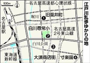 白川公園の南に、乱歩が小学生のころによく歩いた大須商店街=地図〈3〉=がある。当時は見せ物小屋やお化け屋敷が並び、多くの人を集めた。今も演芸場やライブハウスなどが立ち並び、にぎわいの面影を残す。