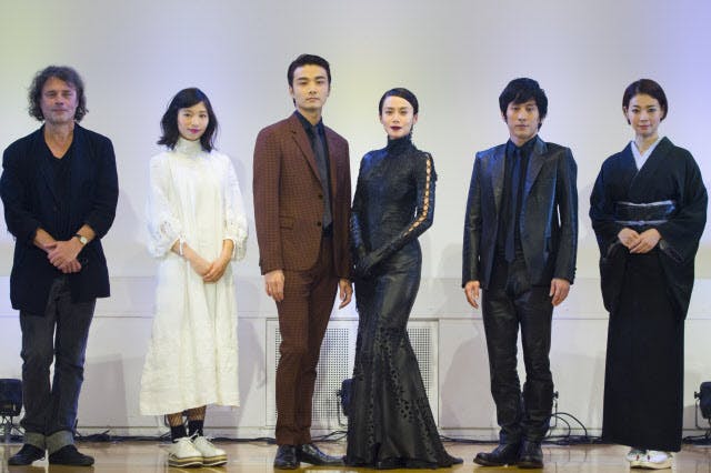 『黒蜥蜴』は1月9~28日東京・日生劇場、2月1~5日大阪・梅田芸術劇場メインホールで上演。写真は製作発表。左からデヴィッド・ルヴォー、相楽樹、井上芳雄、中谷美紀、成河、朝海ひかる(撮影:舞山秀一)
