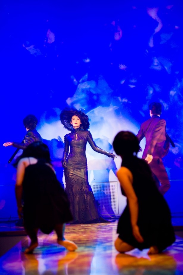 ルヴォー版の「黒蜥蜴」は、ダンスを取り入れ音楽のテーマにタンゴを使うといった新たな世界観で構築。黒蜥蜴に扮した中谷が着用する黒のドレスは、本番に使われる想定のものだ。東京の会見で披露されたルヴォーの舞台イメージの紹介の後に、大阪での会見が始まった。