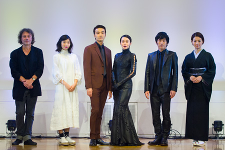 会見より。左から、デヴィッド・ルヴォー、相楽樹、井上芳雄、中谷美紀、成河、朝海ひかる 撮影:舞山秀一