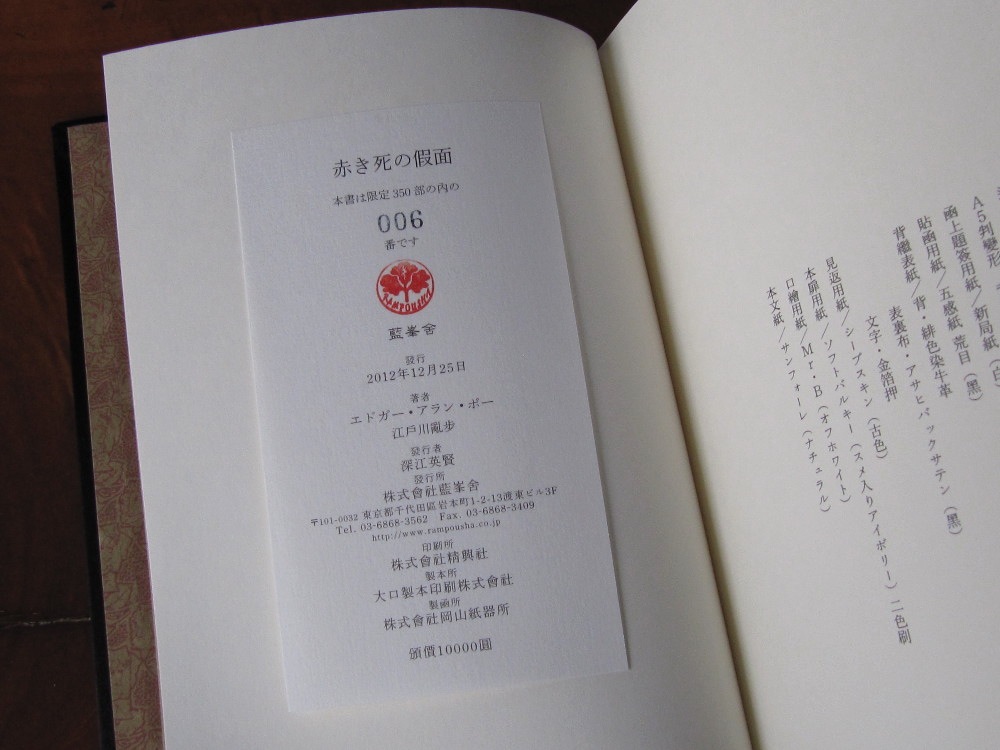 アクセスできないとおっしゃる方のために、とりあえず藍峯舎のサイトから、造本仕様は1月1日付エントリに記しましたので、ここには『赤き死の假面』の基本データを引いておきましょう。