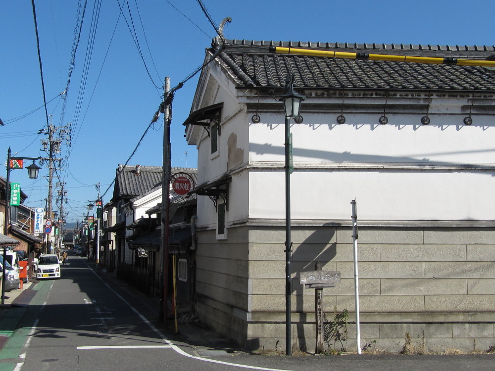 右にみえているのが白壁の酒蔵で、その向こうに位置するのが正面玄関、左にみえる道を画面奥の方向に進んで左に折れると、やがてあやしげな神社みたいな乱歩生誕地碑広場に到着します。