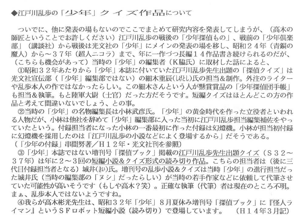 巻末に収録された野村宏平さんの「解説 雑誌《少年》と江戸川乱歩」には、