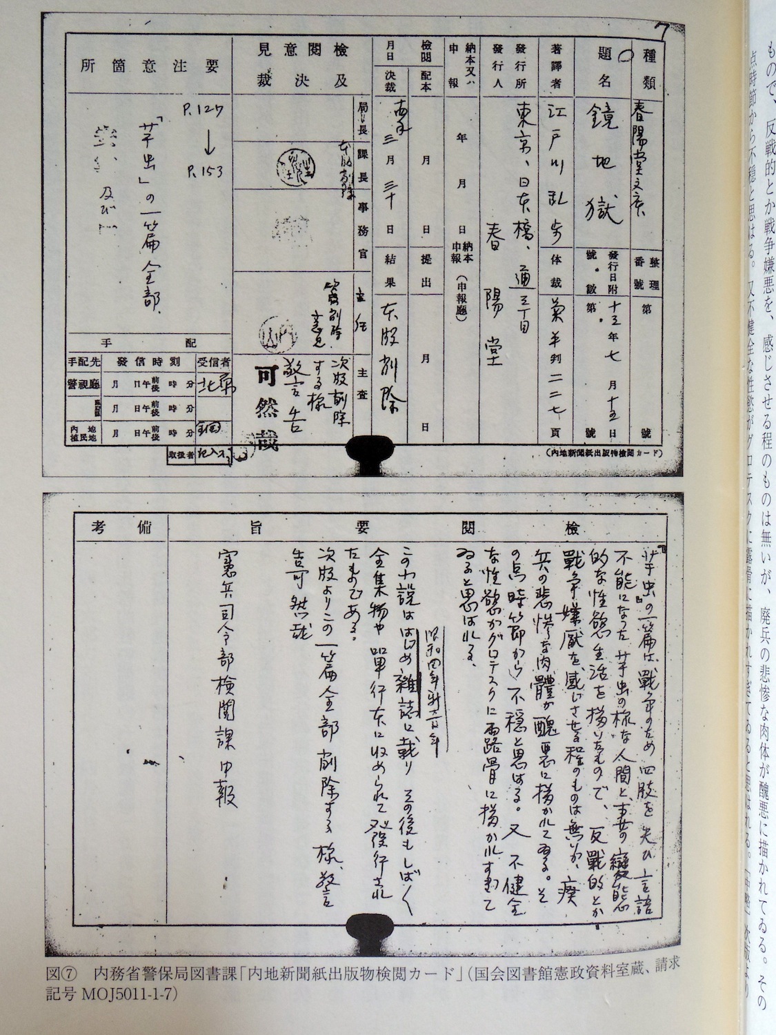 なんと当局のカードが保存されていて、「芋虫」のどこがその忌諱に触れたのかがわかるというのですから、これは貴重な発見でしょう。