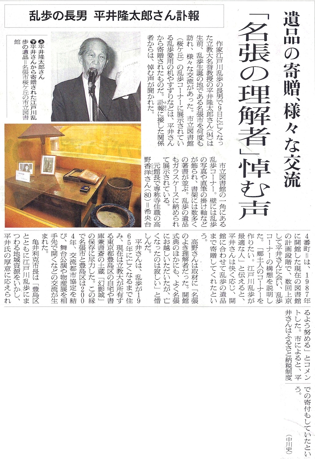 この記事には、お経は読んでも乱歩は読まない高野香洋さんのコメントも出てきてますけど、名張市立図書館が乱歩の遺品を寄贈していただいた、とあるのは高野さんの記憶違いで、あれはあくまでも借用、厳密にいえば永久無償貸与というかたちになっております。