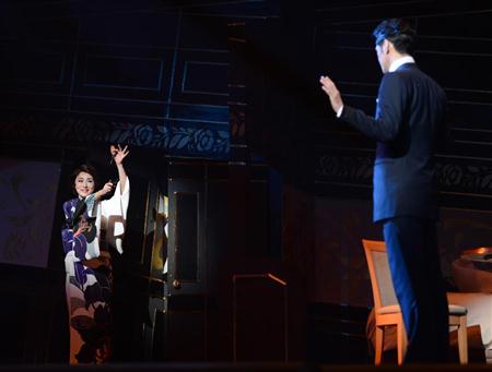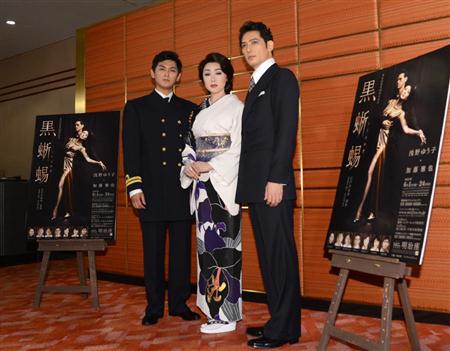 女優、浅野ゆう子(51)が31日、東京・日本橋浜町の明治座で1日から上演される主演舞台「黒蜥蜴」(24日まで)の公開舞台けいこを行った。同作は女盗賊、黒蜥蜴と名探偵、明智小五郎の対決を描いた江戸川乱歩の名作。黒蜥蜴とキスシーンがある愛人、雨宮潤一役の賀集利樹(33)は「(キスが)長くて唇がすごく赤くなってた」とニヤけると、浅野は「押し倒したわけじゃないから」と笑わせた。