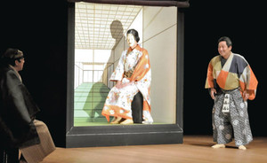 押し絵細工の美女に恋をした男の姿を描いた乱歩の短編「押絵と旅する男」をもとに能楽師の帆足正規さんがオリジナル脚本を仕上げた。大蔵流狂言師茂山七五三(しめ)さんらが演じ、観客を引きつけていた。