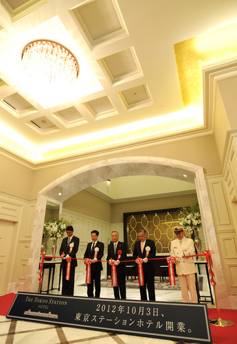 東京ステーションホテルがグランドオープンし、テープカットをする冨田哲郎社長(右から2人目)ら=東京都千代田区で2012年10月3日、久保玲撮影