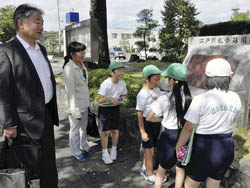 児童らは陣屋通り沿いにある疎開記念碑も訪れ、説明を聞いた。