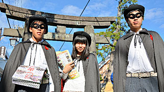怪人二十面相の衣装でチラシを配る人たち=昨年11月の隠街道市、名張市提供