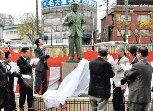 大正から昭和にかけて活躍した小説家、江戸川乱歩(本名平井太郎、一八九四~一九六五年)の銅像が、生誕地である名張市の近鉄名張駅東口にお目見えした。名張ロータリークラブ(RC)が、ことし創立五十周年を迎えたのを記念して建て、市に寄贈。除幕式が七日あり、関係者ら六十人が名張の新たなシンボル誕生を祝った。