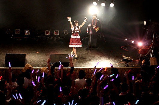 終演後の囲みでは、「昨日原宿でやったんですけど、ほぼ初めてのライブという感じだったので、緊張しました。赤や青のサイリウムが見えたり、掛け声で勇気づけられて、乗り越えることができました」と、同志諸君に感謝。きょうのイベントを大正コンセプトにした理由について、「キネマ倶楽部からイメージして、大正にしようということになりました。私自身、丸尾末広や江戸川乱歩、夢野久作の世界に憧れがあったので、凄く楽しかったです」と明かす。