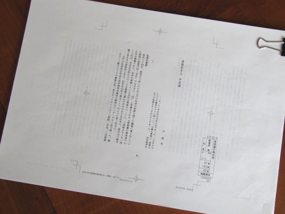 さてこの『屋根裏の散歩者』、本来であれば今春発行されていたはずのところ、私の原稿が長くなり遅くなって大変なことになってしまい、いまごろようよう初校が出てくる運びとはなった次第で、刊行が大幅に遅延する結果を招いてしまいましたこと、あらためてお詫び申しあげます。