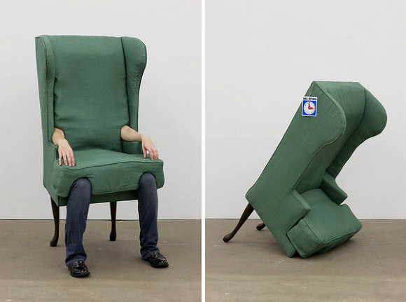 これは、アメリカ人アーティストのJamie Isensteinさんの作品で、2006年に制作されたもの。本来であれば、前後2本ずつ、計4本あるはずのイスの脚が、後ろに2本しかついていません。イスだけで、立たせることは不可能というワケ。