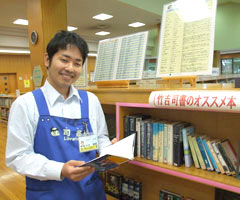 勤務する牛久市立中央図書館には竹吉さんのおすすめ本特設コーナーがある