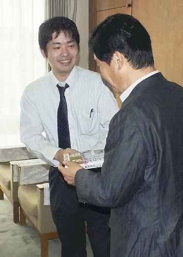 出版された「襲名犯」を藤井市長(右)に贈る竹吉さん