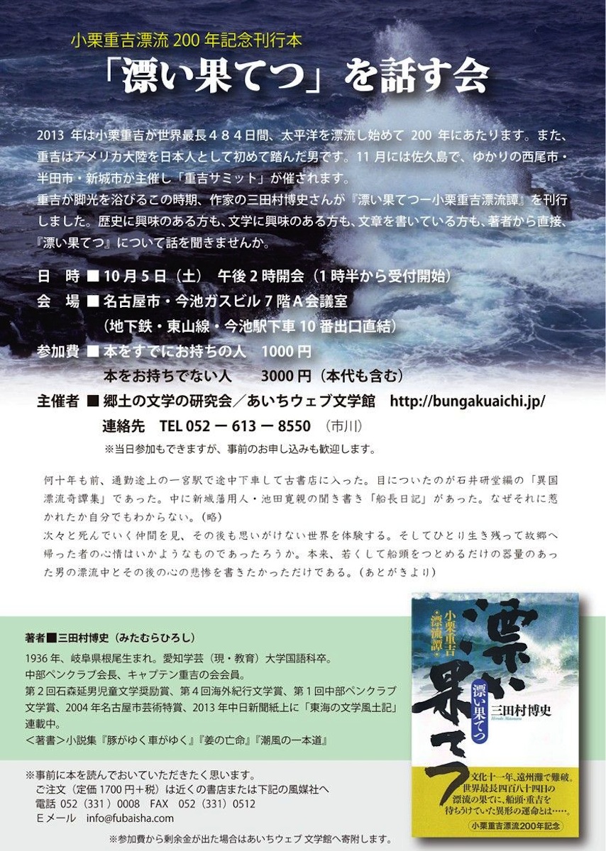 ▼図書出版 風媒社『お知らせ』:『漂い果てつ』を話す会のご案内(2013年8月29日)