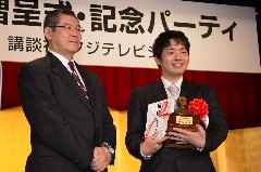【写真説明】「第59回江戸川乱歩賞」贈呈式で、記念品を贈られた竹吉優輔さん(右)=東京・内幸町