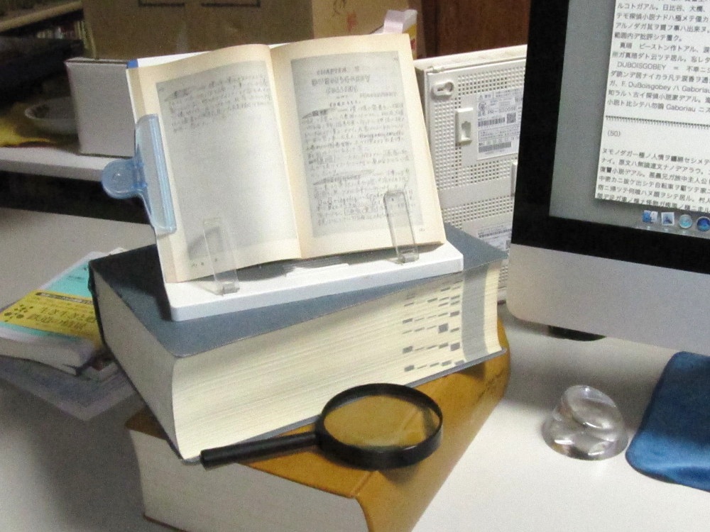 厚めの辞書を二冊積みあげ、そのうえにファイルホルダーを立てて『奇譚/獏の言葉』を据えつけ、さらには先日近所の百円ショップで買ってきた天眼鏡を用意して、粛然と作業に勤しんでおります。