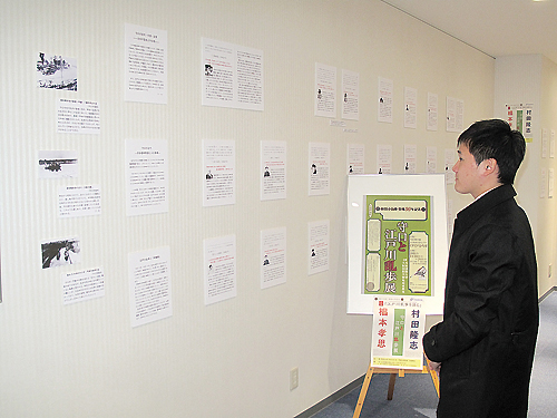 会場では江戸川乱歩の人生と乱歩が守口で生み出した「一枚の切符」「D坂の殺人事件」「屋根裏の散歩者」などの作品を同大学国際コミュニケーション学科と情報デザイン学科の学生たちがあらすじ解説とデザインしたパネルで紹介。