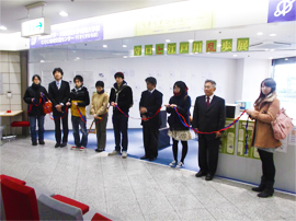 初日には学生と先生による手作りのテープカットが行われ、守口市教育委員会から北山義人生涯学習課長にご参加いただきました。学生の力を活用しての展覧会ということで、テープカットのリボンは学生が持ち、にぎやかに開会しました。