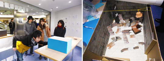 1月11日(土)からくすくすひろばで「明智小五郎登場90年記念 守口と江戸川乱歩展」を開催しています。展示パネルは国際コミュニケーション学部の村田先生と学生が制作し、挿絵と展示してあるジオラマは現代社会学部情報デザイン学科の森友先生と学生が制作しました。