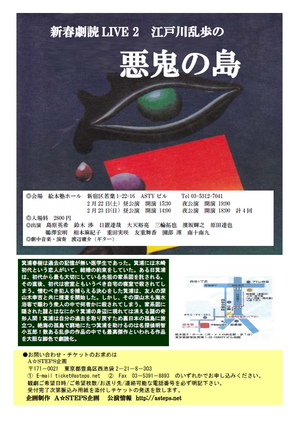 絶海の孤島で窮地にたつ箕浦を助けるのは名探偵明智小五郎!数ある乱歩の作品の中でも最高傑作といわれる作品を大胆な脚色で劇読化。