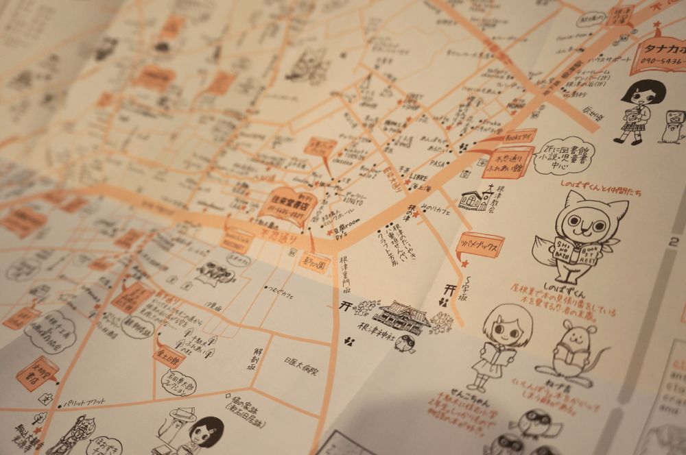 南陀楼さんには古本市以外に、もうひとつアイデアがあった。谷根千の街歩きをするためのマップだ。当時から、谷根千は観光スポットではあったが、熟年以上を対象とした「渋い地図」しかなかった。しかし、「若い世代の感性による多種多様なカフェやギャラリーなどのお店が増えてきていました。古い建物をリノベーションしたり。個性的な書店も多い。ただ、そうしたお店は点としてしか認識されていなくて、お目当てのお店へ行く人はそのまま帰ってしまうパターンが多かった」という。