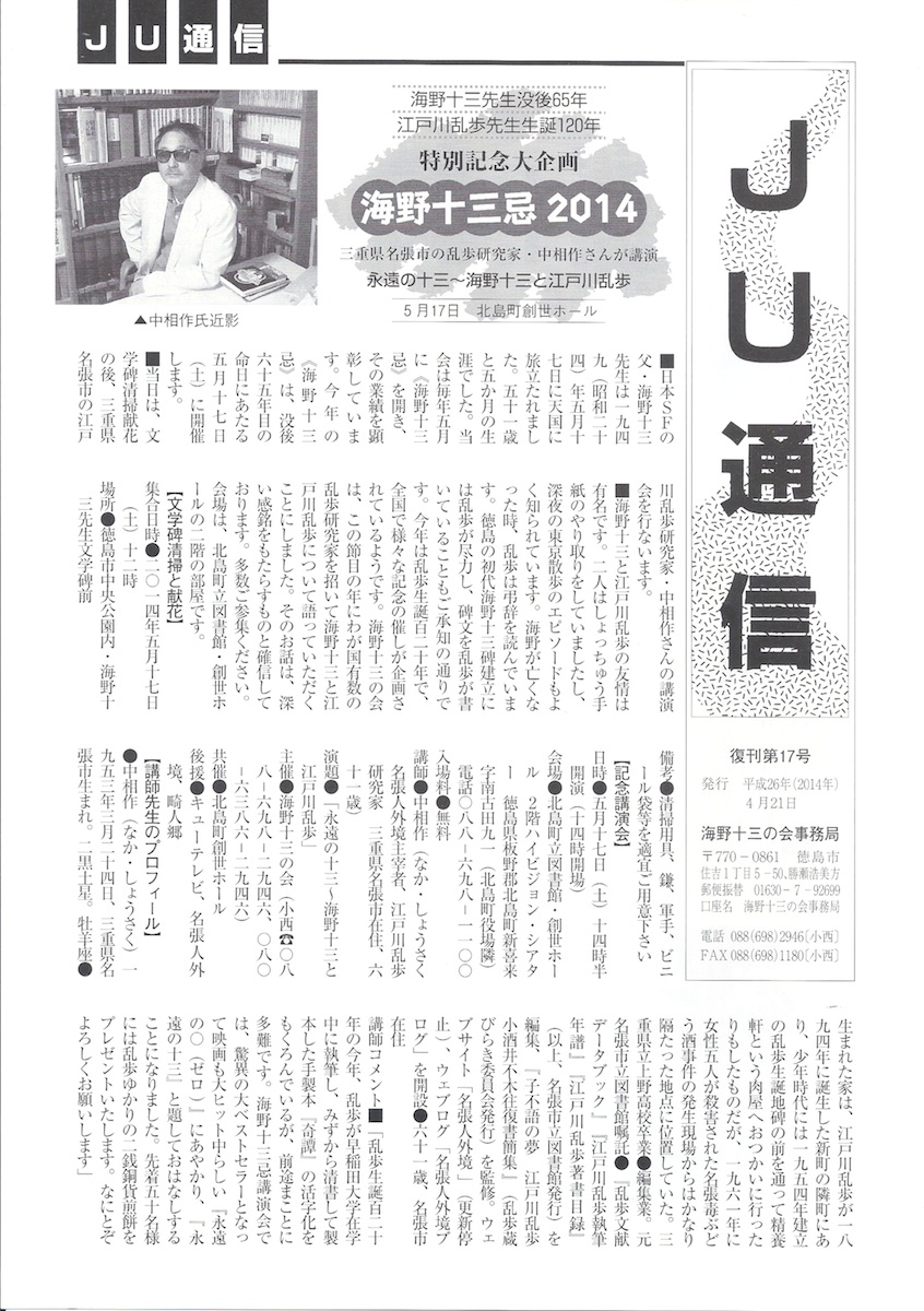 「永遠の十三~海野十三と江戸川乱歩」日時◎2014年5月17日(土)14時半開演(開場14時)会場◎北島町立図書館・創世ホール 2階ハイビジョン・シアタ- 771-0207徳島県板野郡北島町新喜来字南古田91 (北島町役場となり) 電話088・698・1100 入場料◎無料(申し込み不要) 講師◎中相作(なかしょうさく 江戸川乱歩研究家、名張人外境主宰者、 名張市在住) 演題◎「永遠の十三~海野十三と江戸川乱歩」 主催●海野十三の会(小西 電話088・698・2946) |