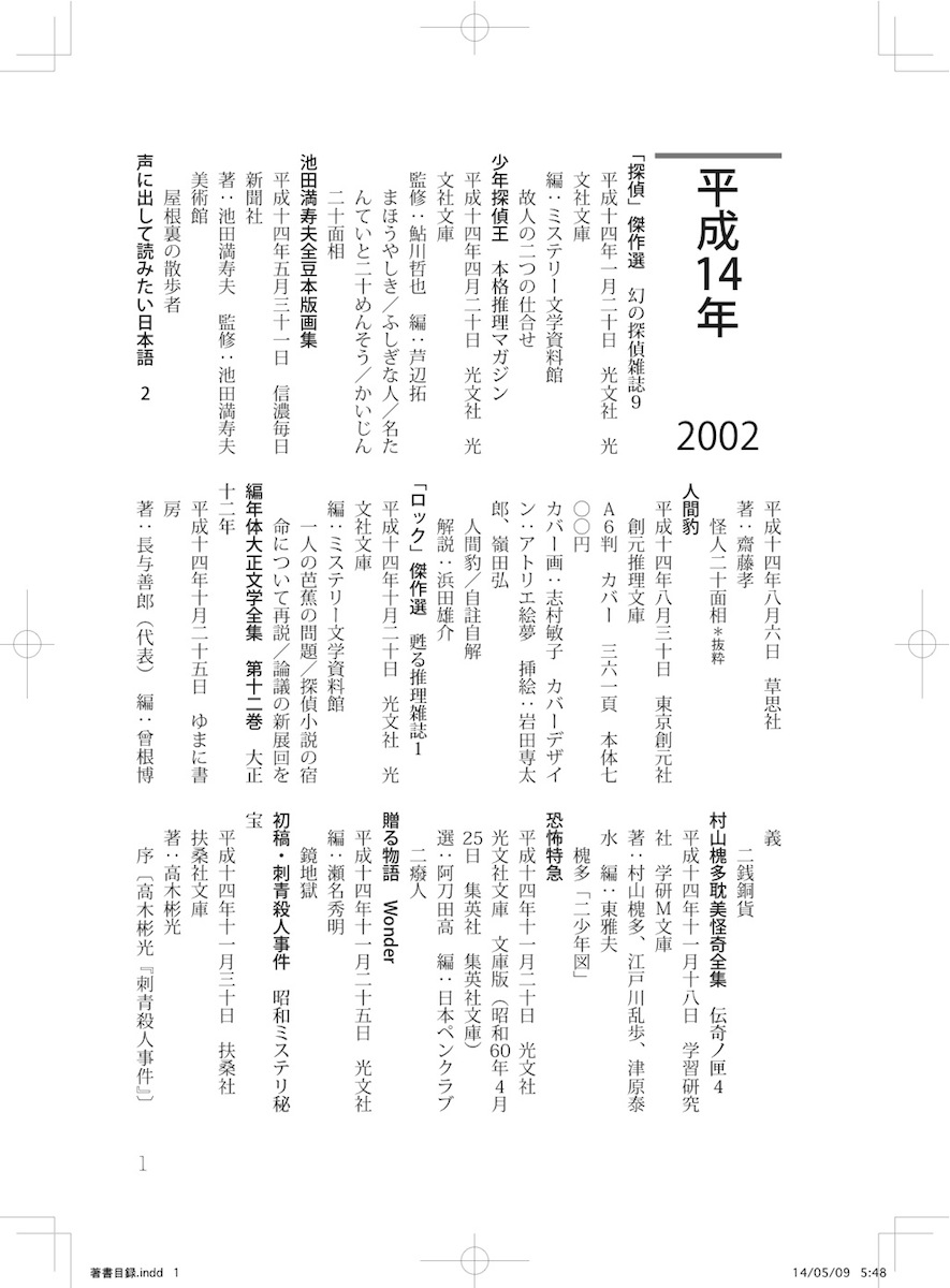 一ページ目がこれ。名張市立図書館の『江戸川乱歩著書目録』は21世紀最初の年、つまり西暦2001年までをカバーしてましたから、「伊賀一筆」第一号では2002年から2013年までを増補することになるんですけど、しかし、こんなことやってた日には、「伊賀一筆」第一号の赤字がいや増すばかりではないか。