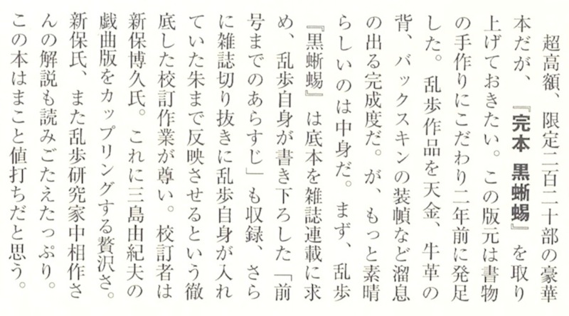 乱歩をフィーチャーしたこの時期恒例の「幻想と怪奇」もさることながら、松坂健さんの連載ブックレビュー「ミステリ・サイドウェイ」で『完本黑蜥蜴』をご紹介いただいていて、とてもうれしく思いました。