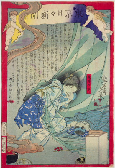 芳幾は浮世絵だけでなく、「東京日日新聞」(現在の毎日新聞)の発起人として活躍します。新聞には、1つの記事を錦絵で表現した「新聞錦絵」が描かれていて、芳幾の絵はその後の錦絵新聞のブームの火付け役にもなりました。
