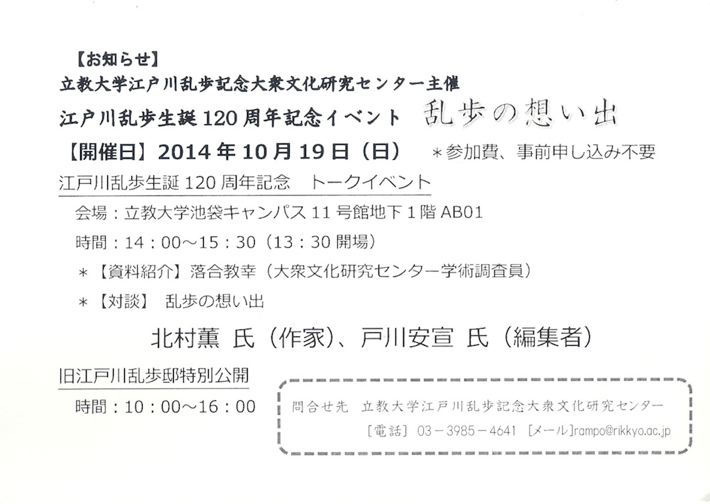 ▼東京創元社:トークイベント「江戸川乱歩生誕120周年記念イベント 乱歩の想い出」が池袋・立教大学にて開催されます(10月19日)(2014年9月12日)